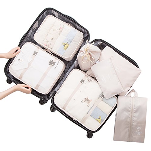 Belsmi 7 Set Packing Cubes With Shoe Bag – Compression Travel Luggage Organizer (Beige)