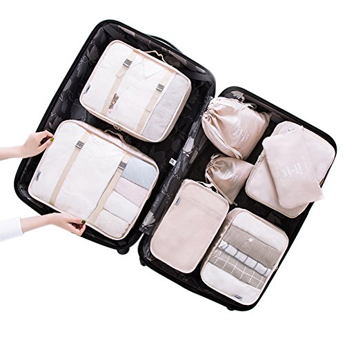 Belsmi 8 Set Packing Cubes – Waterproof Compression Travel Luggage Organizer With Shoes Bag (Beige)