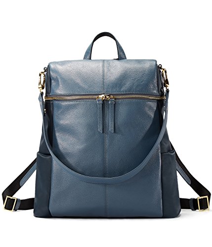 EMINI HOUSE Fashion Women Backpack Goatskin Grain Genuine Leather School Bag Girls Shoulder Bag Ladies Daily Purse Laptop-Grey Blue
