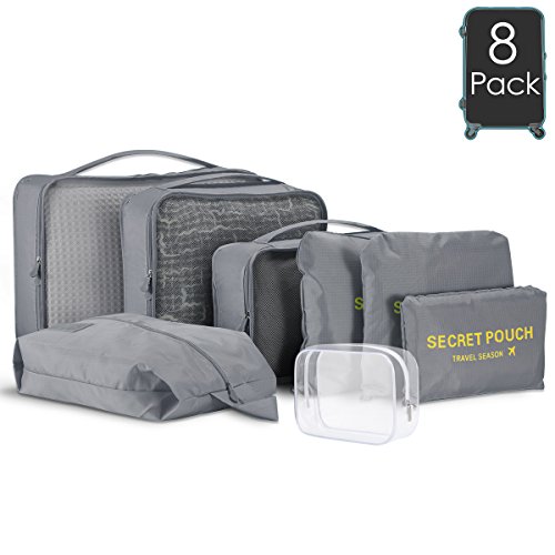 KINGMAS 8 Set Packing Cubes – 6 Travel Organizer Luggage Compression Pouches + 1 Clear Toiletry Bags + 1 Shoe Bag
