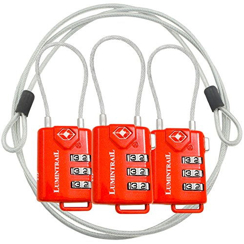 Lumintrail 3 Pack TSA Approved All Metal Personalized International Luggage Combination Travel Lock with 4-ft Steel Cable, for Suitcase and Baggage – Assorted Colors (Red)