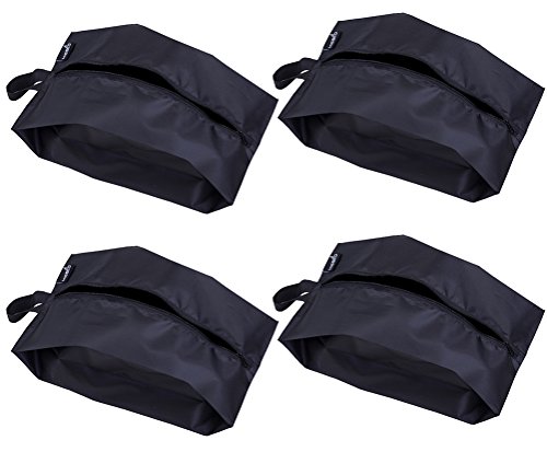 Good bags for dirty shoes These are decent quality little travel shoe bags. I ran them under a shower with a roll of toilet paper inside and after a 30 second test, the paper was still completely dry. I question whether full submersion for time would continue to achieve that result, but I did not specifically test that. These seem to work well enough for me. I use one for golf shoes traveling in the car, another for gym shoes and two for the suitcase. Every application has worked out so far. The plain black color was…