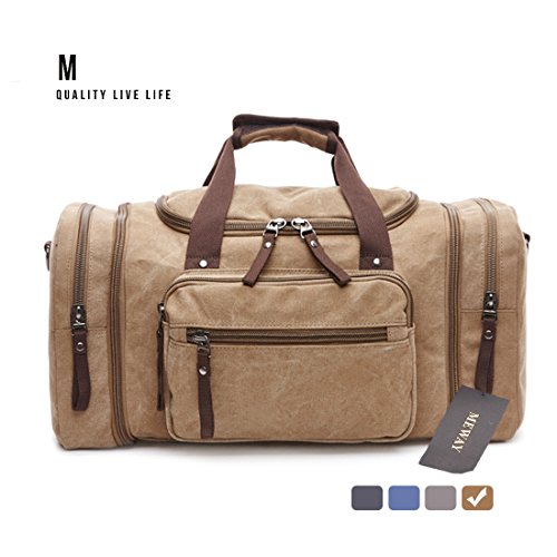 Oversized Canvas Leather Weekender Bag Travel Duffel Shoulder Handbag with Strap by MEWAY (CANVAS, KHAKI)
