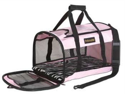 Petmate Large Softside Kennel cab with shoulder strap allows you to take your small dog or cat on the go. Features an interior orthopedic pad in a fashion print. Generous ventilation top, sides and door. Dual zippered opening for top and front. 20 by 11-1/2 by 12 pink/zebra