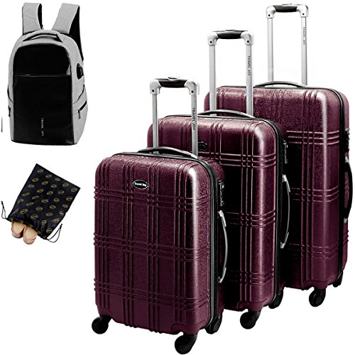 Travel Joy CROSSLAND 3 Piece Luggage Set, Glossy Scratch-resistant Surface, with One Gift Backpack and One Gift Shoes Bag, Lightweight Spinner Trolley (BURGUNDY)