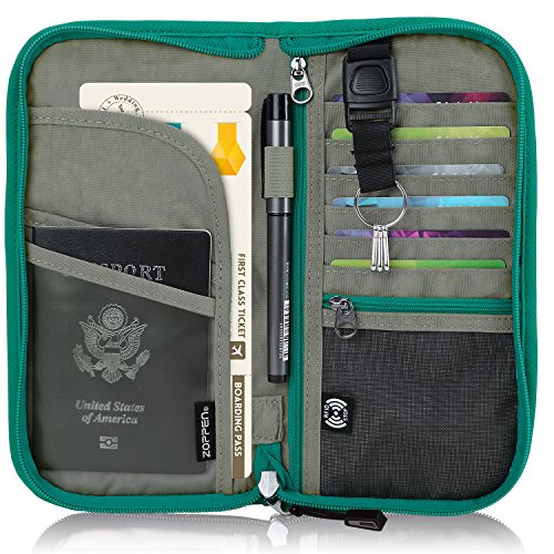 Zoppen RFID Travel Wallet & Documents Organizer Zipper Case, Passports Holder Removable Wristlet Strap (Mint Green)